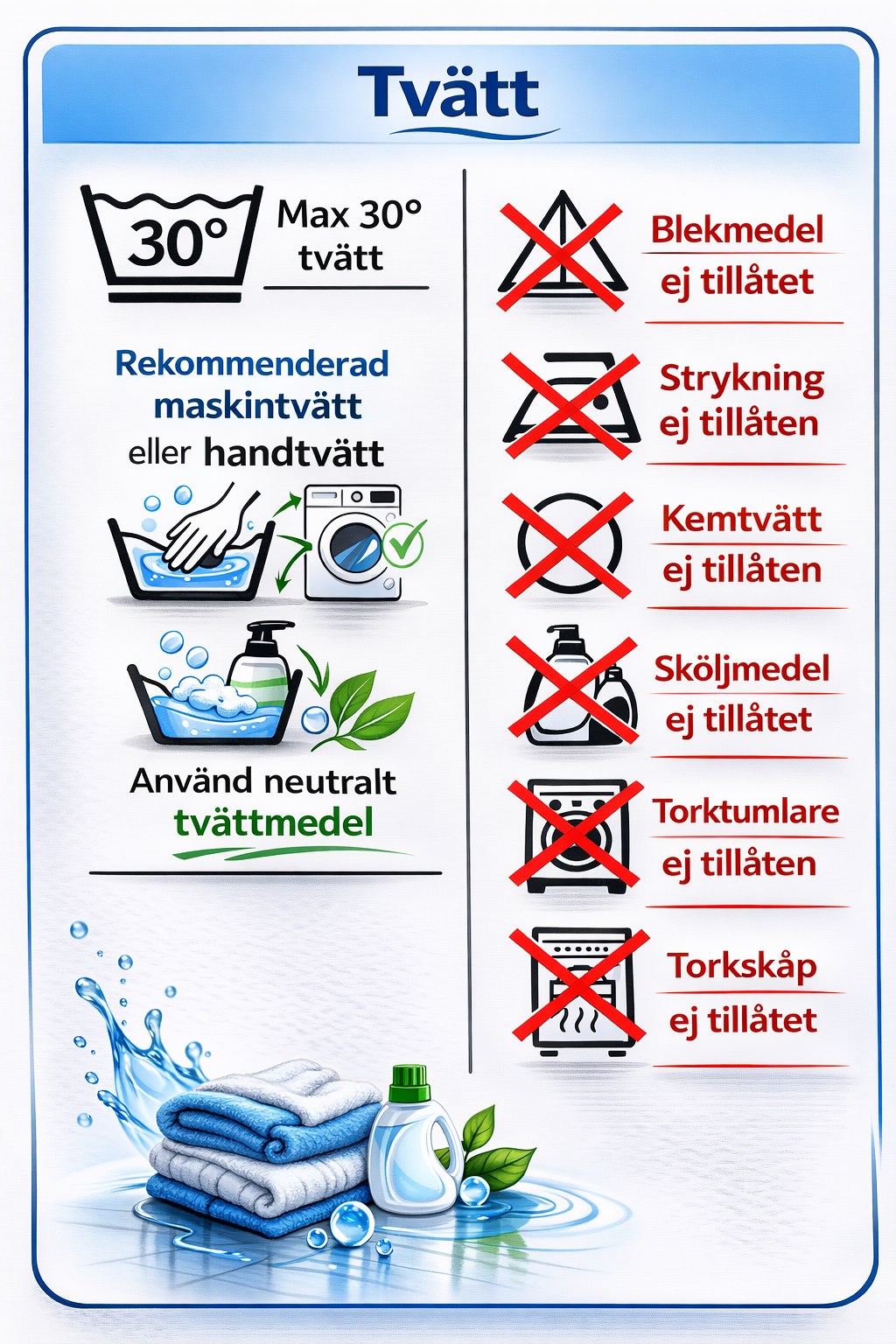 - Om inget annat anges gäller skonsam maskintvätt, max 30 °C, eller handtvätt.